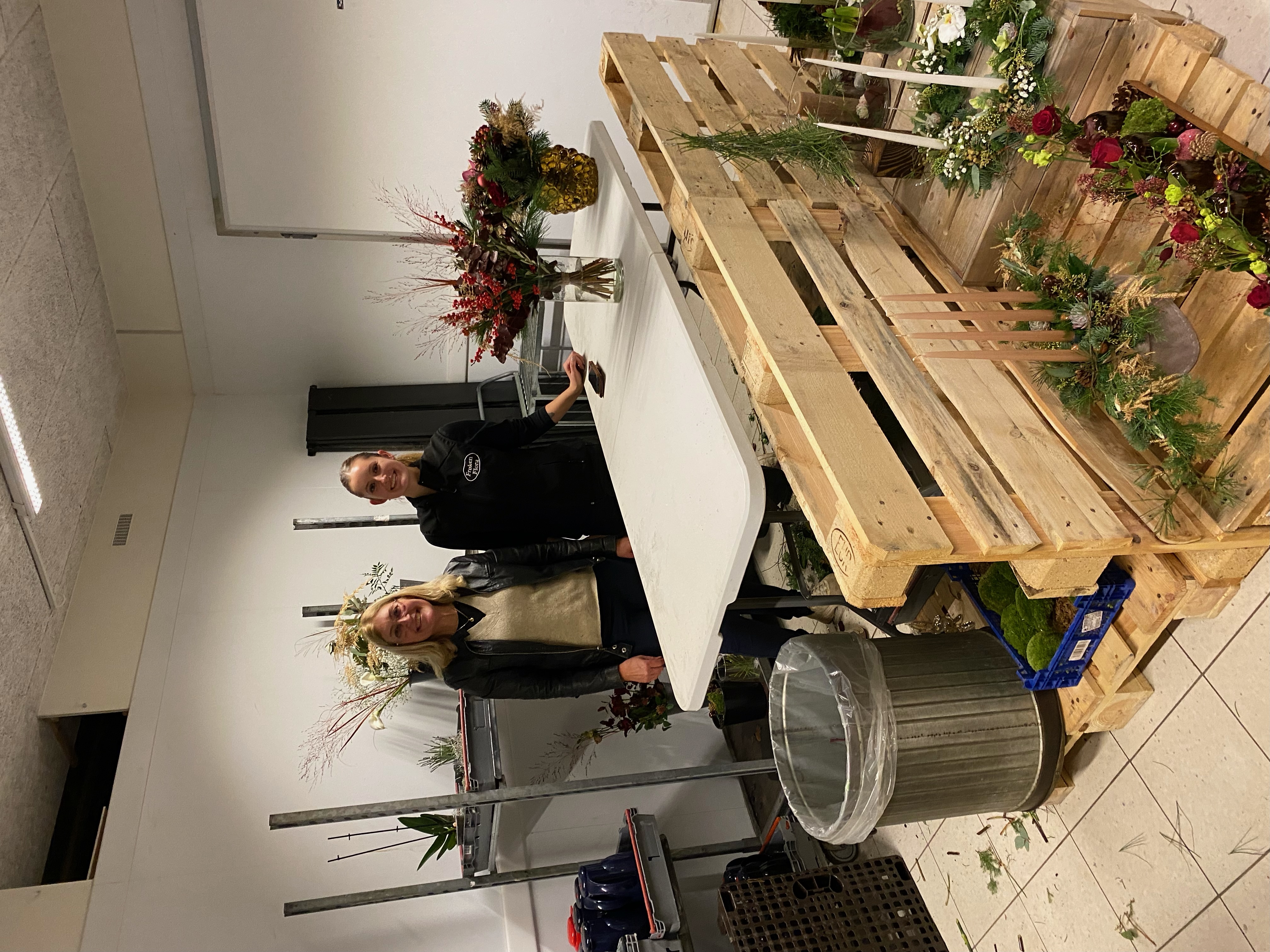 hvor 50 forventningsfulde deltagere så de 2 inspirerende og kreative blomsterpiger fra frøken Flora, DagliBrugsen Tistrups blomsterafdeling, lave smukke julede blomsterkreationer.