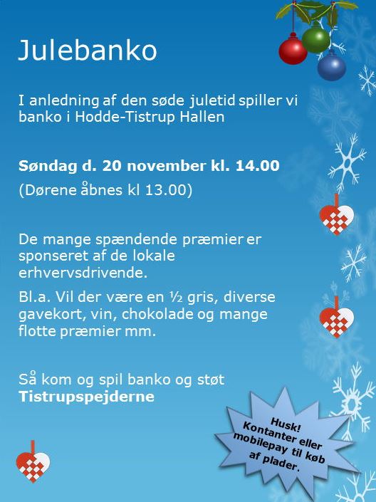 Julebanko Tistrup spejderneHT Hallen 17-11-2016, 03:51 - Tistrup Forfatter: henry × 07-12-2025 - Tag med på rejse med Anne-Vibeke i et foredrag. 04-12-2025 - Tistrup Filmklub viser film i Janus 01-12-2025 - Plastmager elev hos Primo Danmark i Tistrup 24-11-2025 - Guideline til fondsansøgninger 13-11-2025 - Jule tamtam i Janus 06-11-2025 - Jobansøgning - Primo Danmark 02-11-2025 - Nye beboere på Poppelvej 11 30-10-2025 - Julegave ideer fra Tistrup gave,ure,guld og sølv 18-10-2025 - Tistrup Filmklub viser "Forrest Gump" 16-10-2025 - “Få et gratis græskar til Halloween 04-10-2025 - Hellehallen - gratis aktiviteter 02-10-2025 - 35 år på Primo