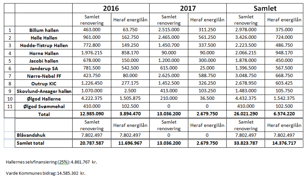 De 34 mio. kroner fremgår af nedenstående fordeling, og fremkommer ved, at der kan optages energilån for de investeringer der medfører besparelser på energi på 14. mio. kroner, at hallerne selv skal betale 25%, svarende til 5 mio. kroner og sidst renoveringspuljen på 15 mio. kroner.