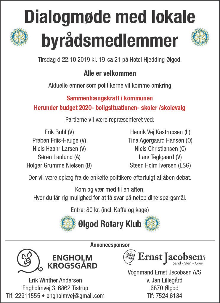 I lighed med sidste år vil Ølgod Rotary Klub invitere borgere og lokale byrådsmedlemmer til debat om visionerne og forventningerne til anden halvdel af denne byrådsperiode inden kommunalvalget i 2021. Sidste år mødte 70 op, og der satses på et ligeså stærkt fremmøde i år.