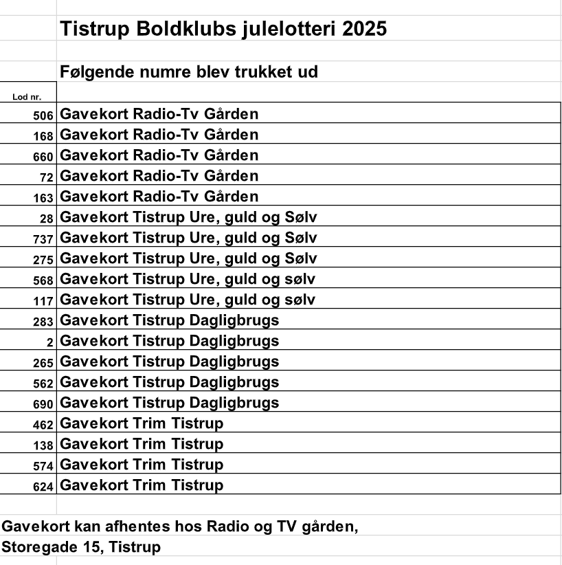 TB Julelotteri 2025 TISTRUPTBTB julelotteri 16-12-2025, 05:48 - Tistrup Forfatter: Tistrup Mediehus Her er vinder- oversigten × 21-12-2025 - Julehilsen fra TM 07-12-2025 - Tag med på rejse med Anne-Vibeke i et foredrag. 04-12-2025 - Tistrup Filmklub viser film i Janus 01-12-2025 - Plastmager elev hos Primo Danmark i Tistrup 24-11-2025 - Guideline til fondsansøgninger 13-11-2025 - Jule tamtam i Janus 06-11-2025 - Jobansøgning - Primo Danmark 02-11-2025 - Nye beboere på Poppelvej 11 30-10-2025 - Julegave ideer fra Tistrup gave,ure,guld og sølv 18-10-2025 - Tistrup Filmklub viser "Forrest Gump" 16-10-2025 - “Få et gratis græskar til Halloween 04-10-2025 - Hellehallen - gratis aktiviteter
