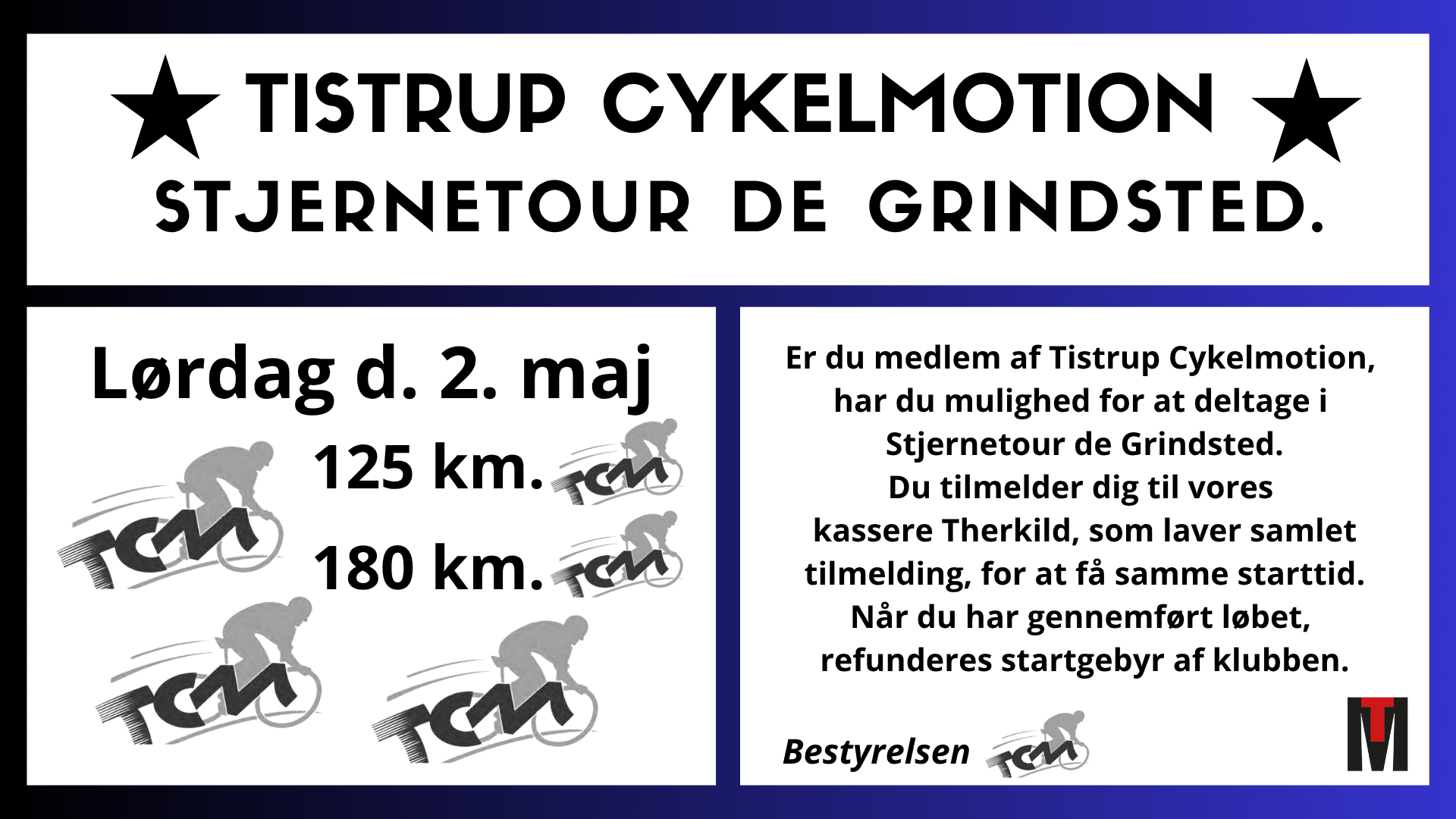 Hop ind på Facebook-siden Tistrup Cykelmotion, send dine oplysninger til vores kasserer Therkild – så sørger han for tilmeldingen.
