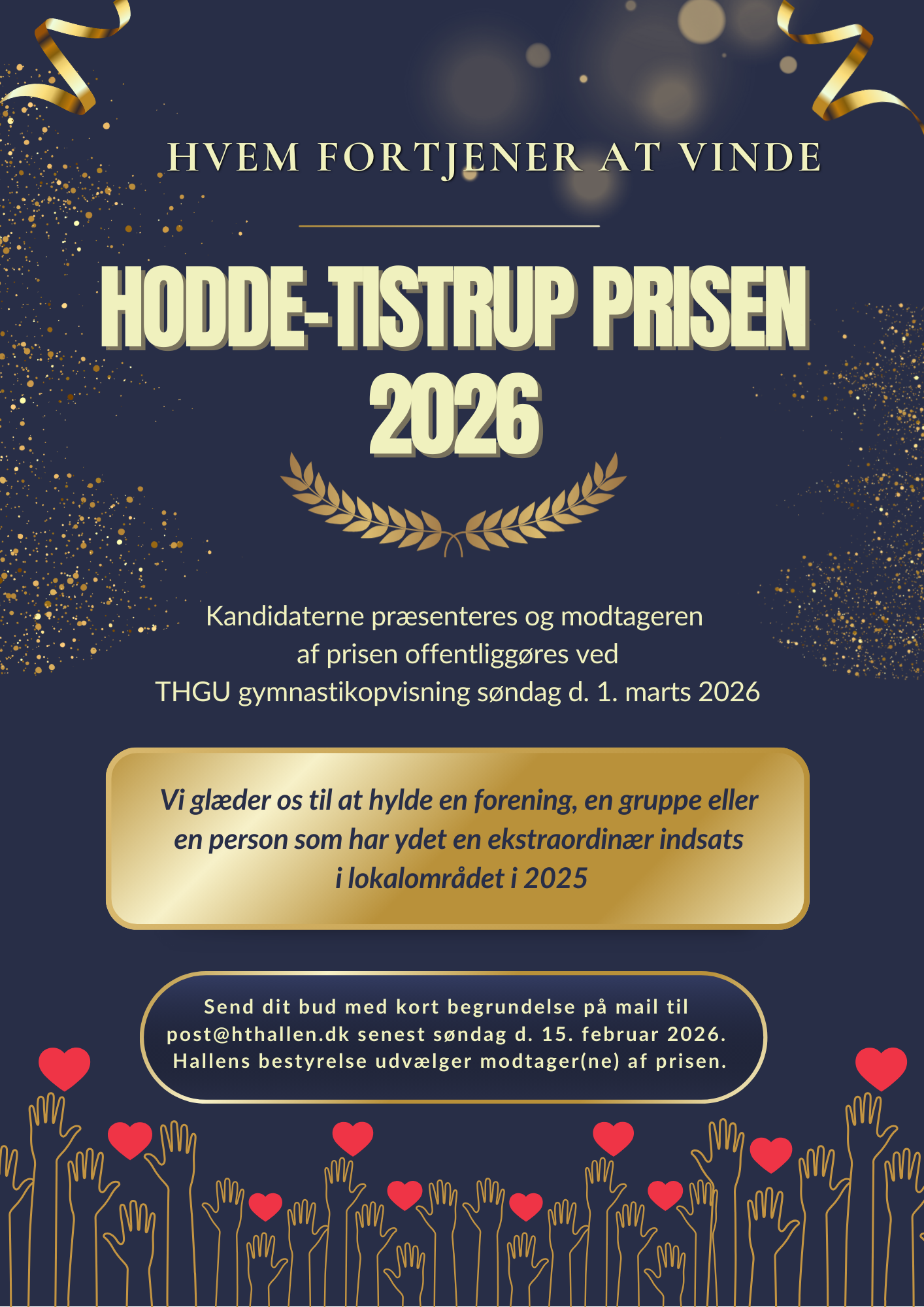 Prisen uddeles søndag d. 2. marts 2025 til den årlige gymnastikopvisning i Hodde-Tistrup hallen, og vi har brug for DIN hjælp til at finde den rette vinder.